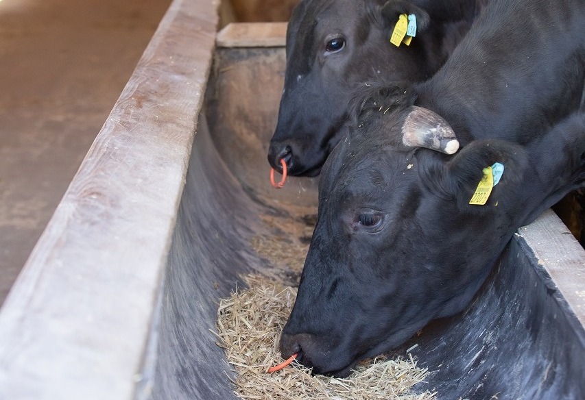 仔牛の時期は丈夫な内臓と骨格を作るため、栄養の高い良質な乾草を与えます。乾草を与えしっかりと“腹づくり”を行うことで、十分な飼料を摂取できる丈夫な体をつくることにつながるのです。5~6か月間この腹づくりをしっかりと行ったら、それ以降は稲わらに限定して必要最低限の栄養にとどめます。その後、濃厚な飼料を増やすことでおいしい奥出雲和牛に育ちます。
